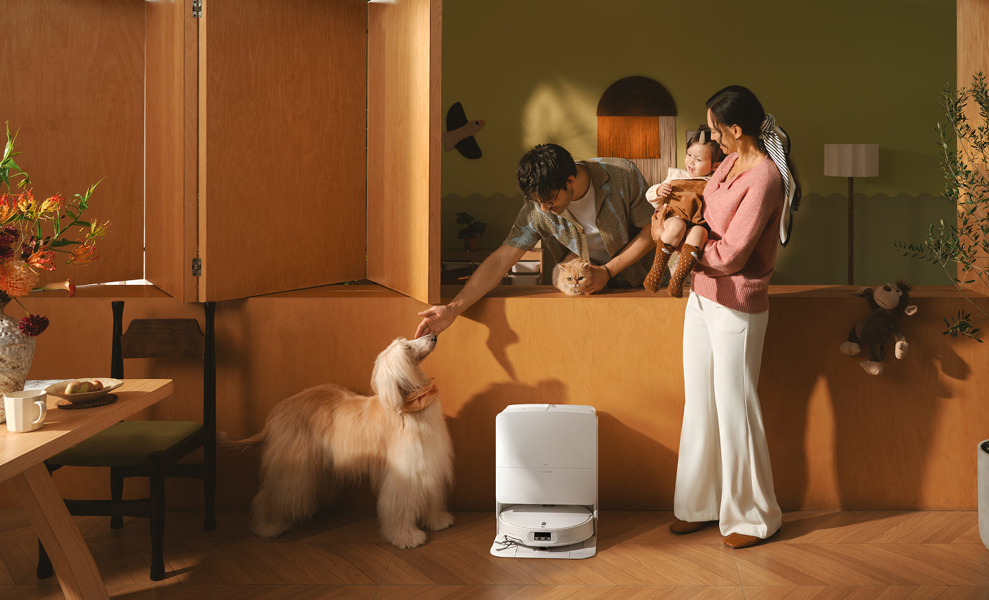 The robot can automatically search for pets, finding where they’re hidden. You can also check your pet's location and status when you’re away.
